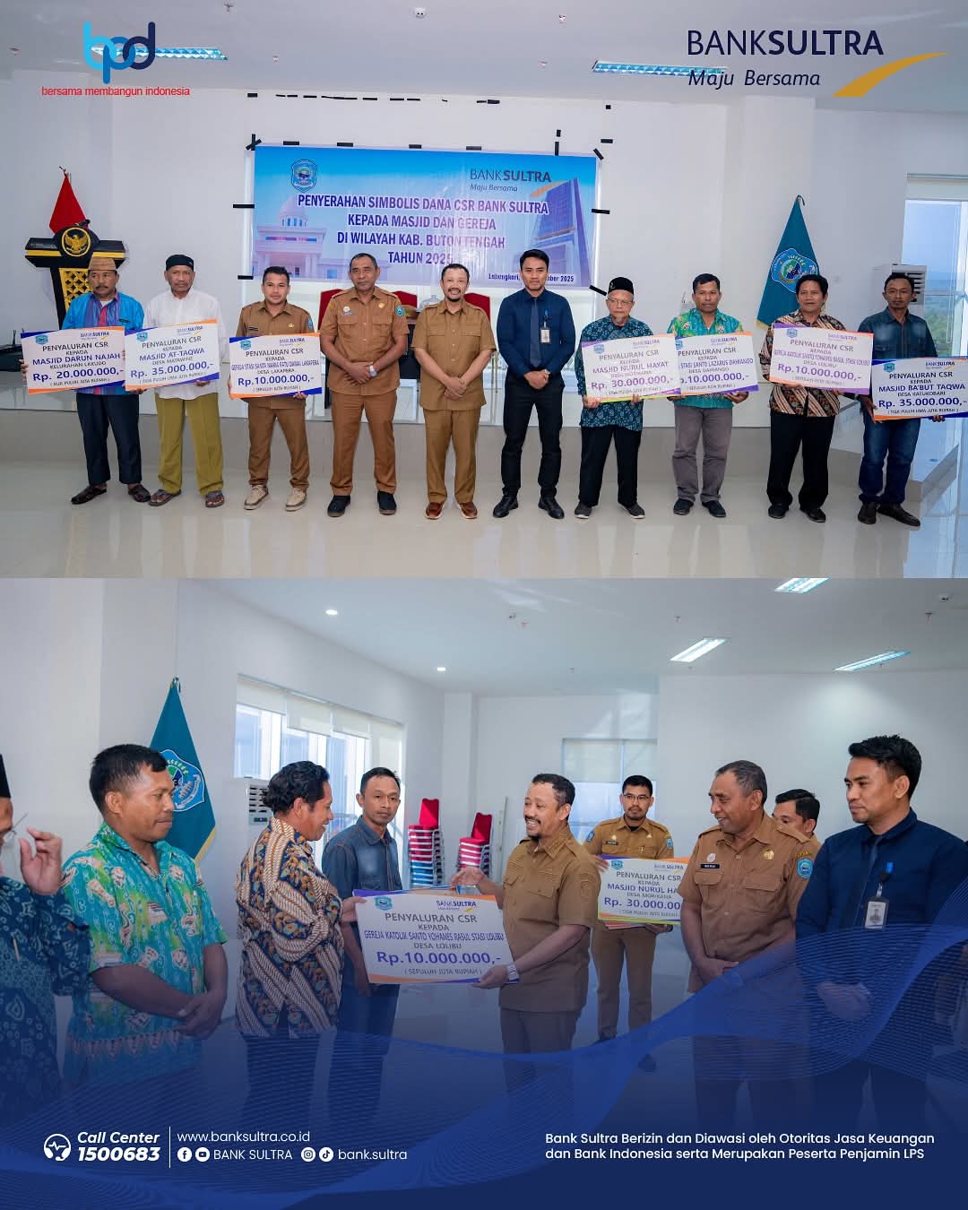 Figursultra.com, Labungkari – Bank Sultra kembali menunjukkan komitmennya dalam mendukung pembangunan daerah, khususnya di bidang keagamaan. Hal ini diwujudkan melalui penyaluran dana Corporate Social Responsibility (CSR) untuk sejumlah Masjid dan Gereja di Kabupaten Buton Tengah. Penyerahan bantuan berlangsung di Aula Pancana Lantai V Kantor Bupati Buton Tengah, Senin (15/9/2025). Kegiatan ini turut dihadiri Plt. Sekretaris Daerah Buton Tengah, Muh. Rijal, serta jajaran kepala OPD lingkup Pemkab Buton Tengah.