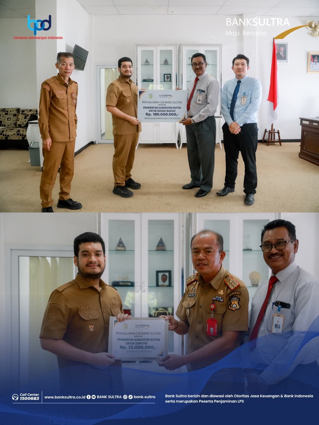 Penyerahan bantuan dilakukan secara simbolis oleh Kepala Cabang Bank Sultra Pasarwajo, Bapak Kamaluddin Rahim, kepada Bupati Buton, Alvin Akawijaya Putra, S.H., yang turut disaksikan oleh Sekda Buton, La Ode Syamsuddin, S.Pd, MSi, Kepala Dinas Perumahan dan Kawasan Permukiman, Nurul Kudus Tako, ST, M.Si dan Plt. Kabag Kesra Setda Kab. Buton, Parlindungan Toruntju, ST, M.Si. bertempat di Kantor Bupati Buton, Senin (09/02).